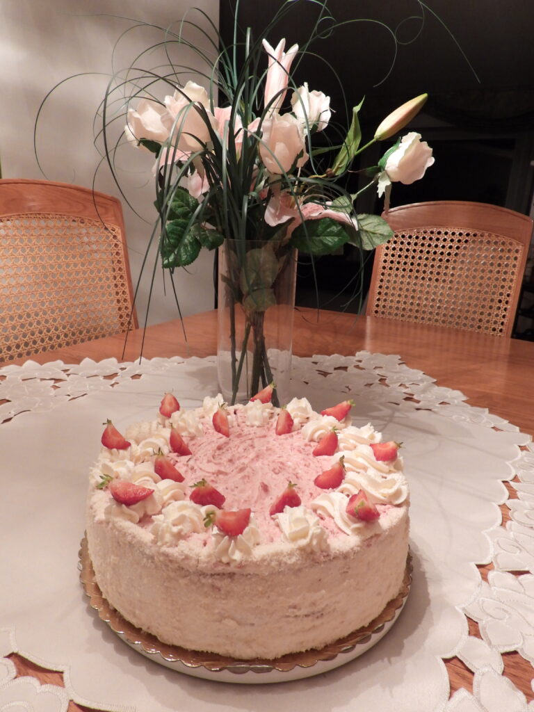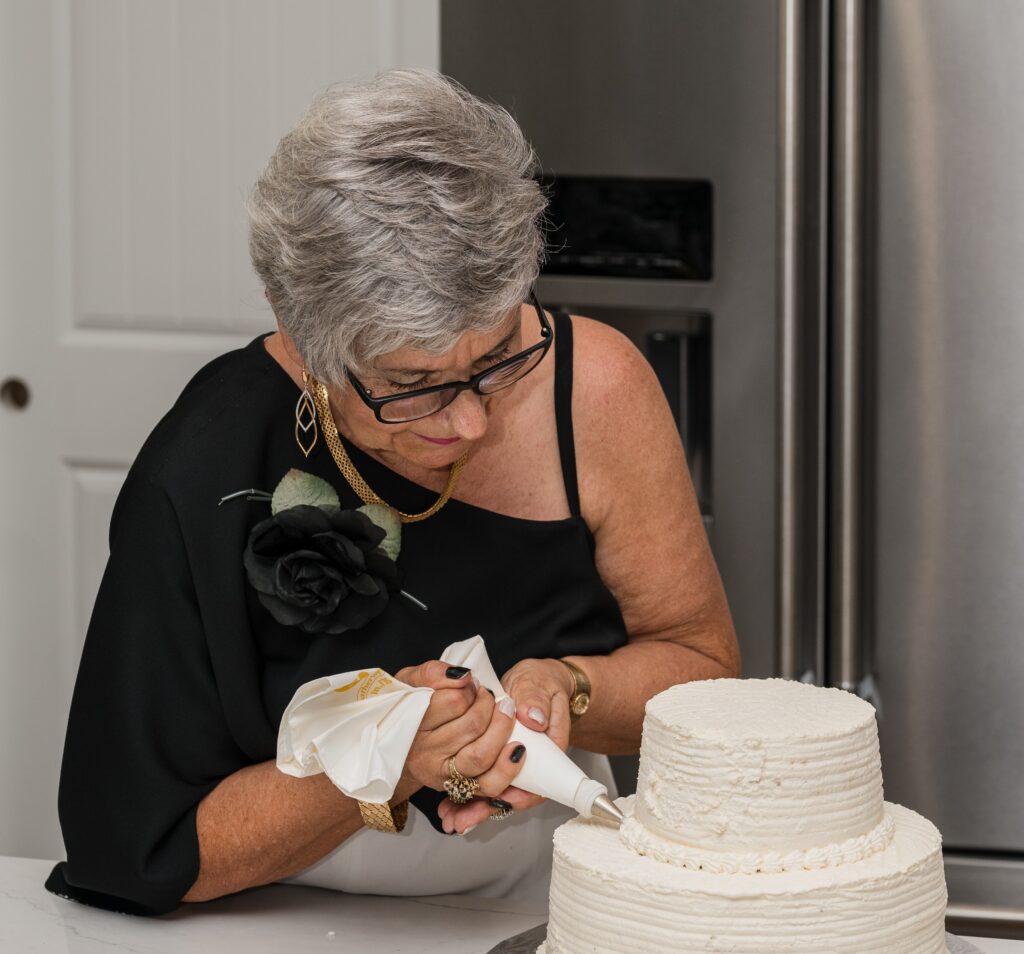 A rare photo of Gisela working on the final touches of one of her beautiful tortes. This was the wedding cake torte for one of her grandsons. She has made her amazing tortes for many friends and family, and still continues to create new recipes that delight everyone!